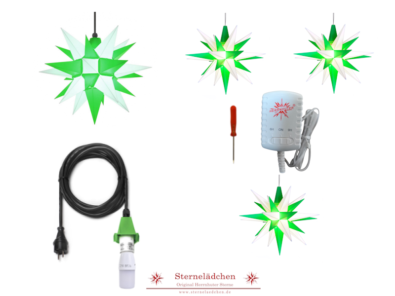 3 x Herrnhuter Stern A1e ( 13 cm ) weiß/grün, mit LED, vormontiert + 1 x Netzgerät ( für 1 - 4 Sterne )