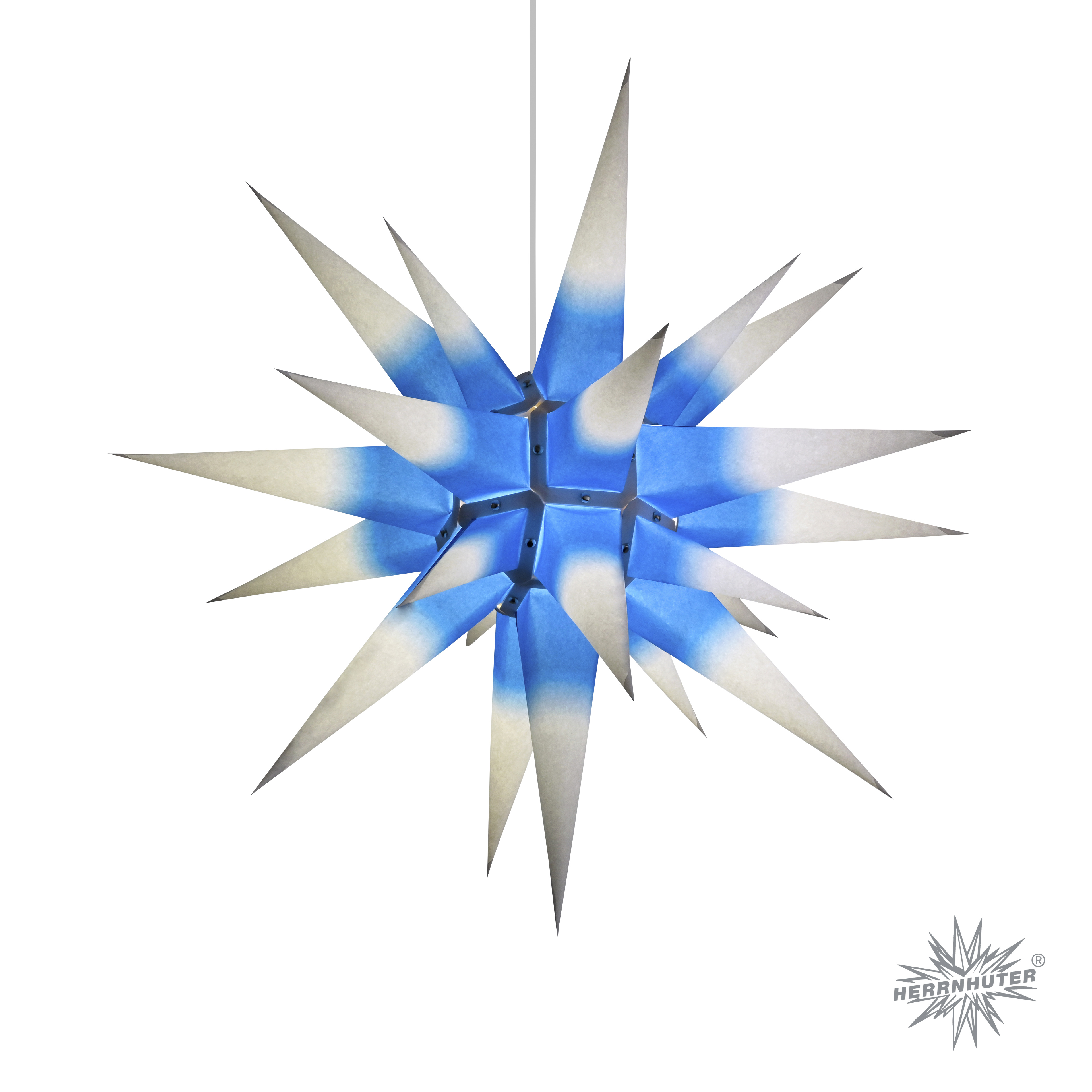 Herrnhuter Stern i6 weiß mit blauem Kern + Innenkabel