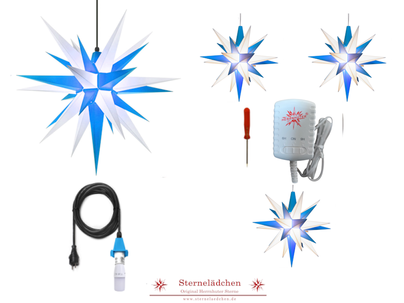 3 x Herrnhuter Stern A1e ( 13 cm ) weiß/blau, mit LED, vormontiert + 1 x Netzgerät ( für 1 - 4 Sterne )